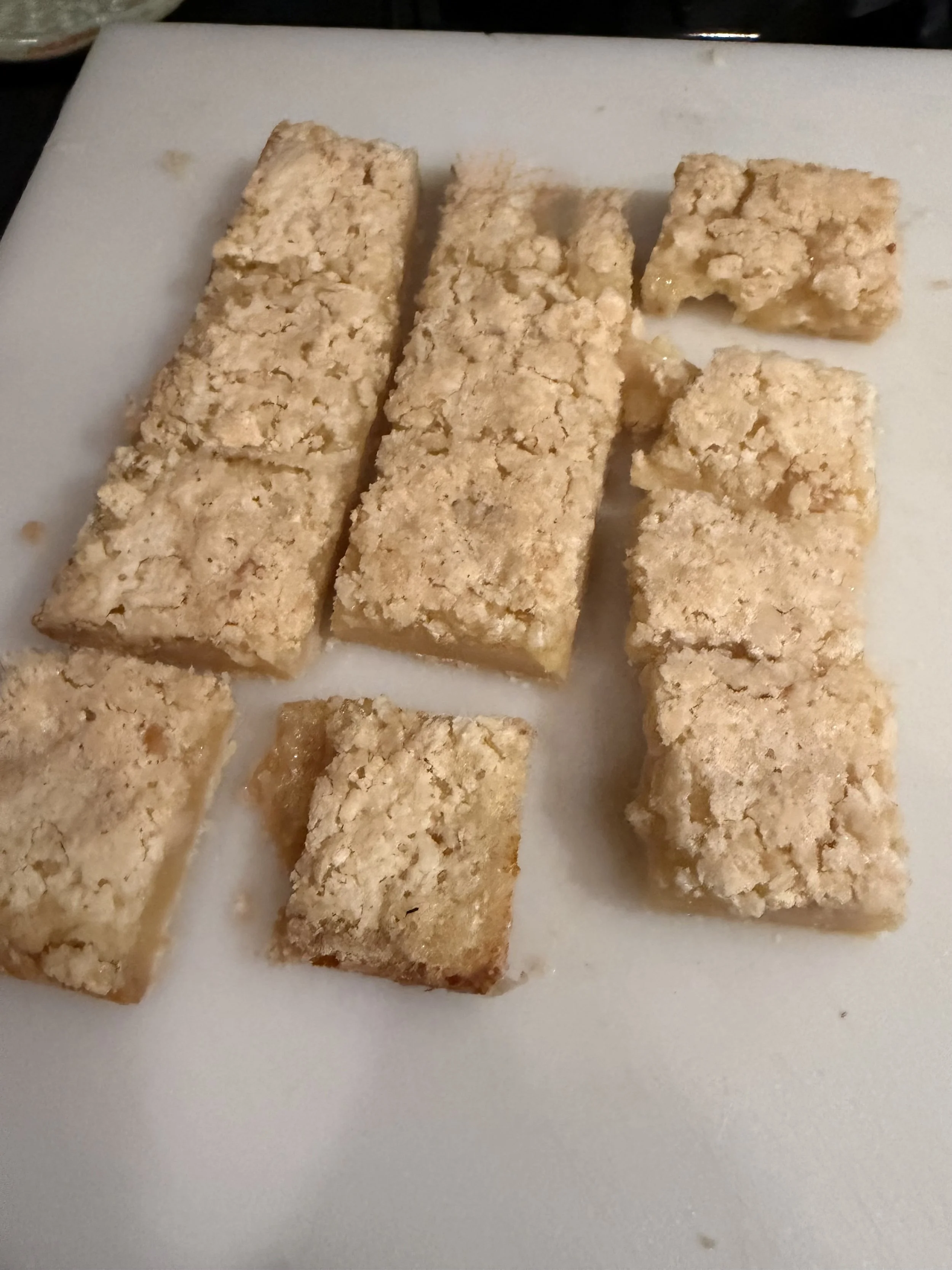 Lemon Macadamia Bars (I forgot to dust with powdered sugar). Make sure you let cool for 24 hours after cutting. They set up perfectly! Recipe Link
